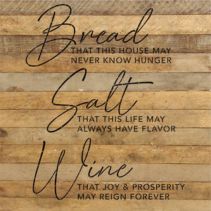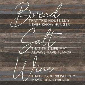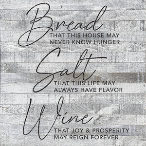 Bread that this house may never know hunger Salt that this life may always have flavor. Wine that joy & prosperity may reign forever 28x28 Reclaimed Wood Sign Second Nature by Hand product are Made in the USA by skilled craftsmen in WI. We source distressed reclaimed materials throughout North America that ensures no two Second Nature by Hand signs in the world are the same. The wood for this sign may have come from a ship yard, old factory or a huge variety of other sources. Buying reclaimed wood products is good for the environment. Due to the reclaimed nature of this product, colors and wood tones/features may vary slightly.