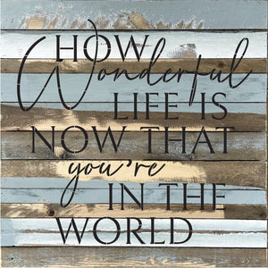 How wonderful life is now that you're in the world 28x28 Reclaimed Wood Sign Second Nature by Hand product are Made in the USA by skilled craftsmen in WI. We source distressed reclaimed materials throughout North America that ensures no two Second Nature by Hand signs in the world are the same. The wood for this sign may have come from a ship yard, old factory or a huge variety of other sources. Buying reclaimed wood products is good for the environment. Due to the reclaimed nature of this product, colors and wood tones/features may vary slightly.