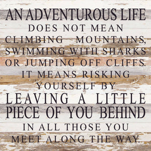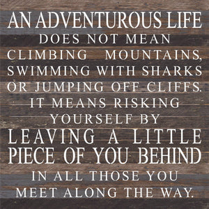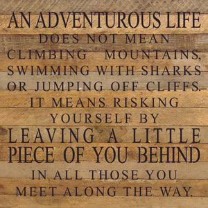 An adventurous life does not mean climbing mountains, swimming with sharks, or jumping off cliffs. It means risking yourself by leaving a little piece of you behind in all those you meet along the way. / 28"x28" Reclaimed Wood Sign