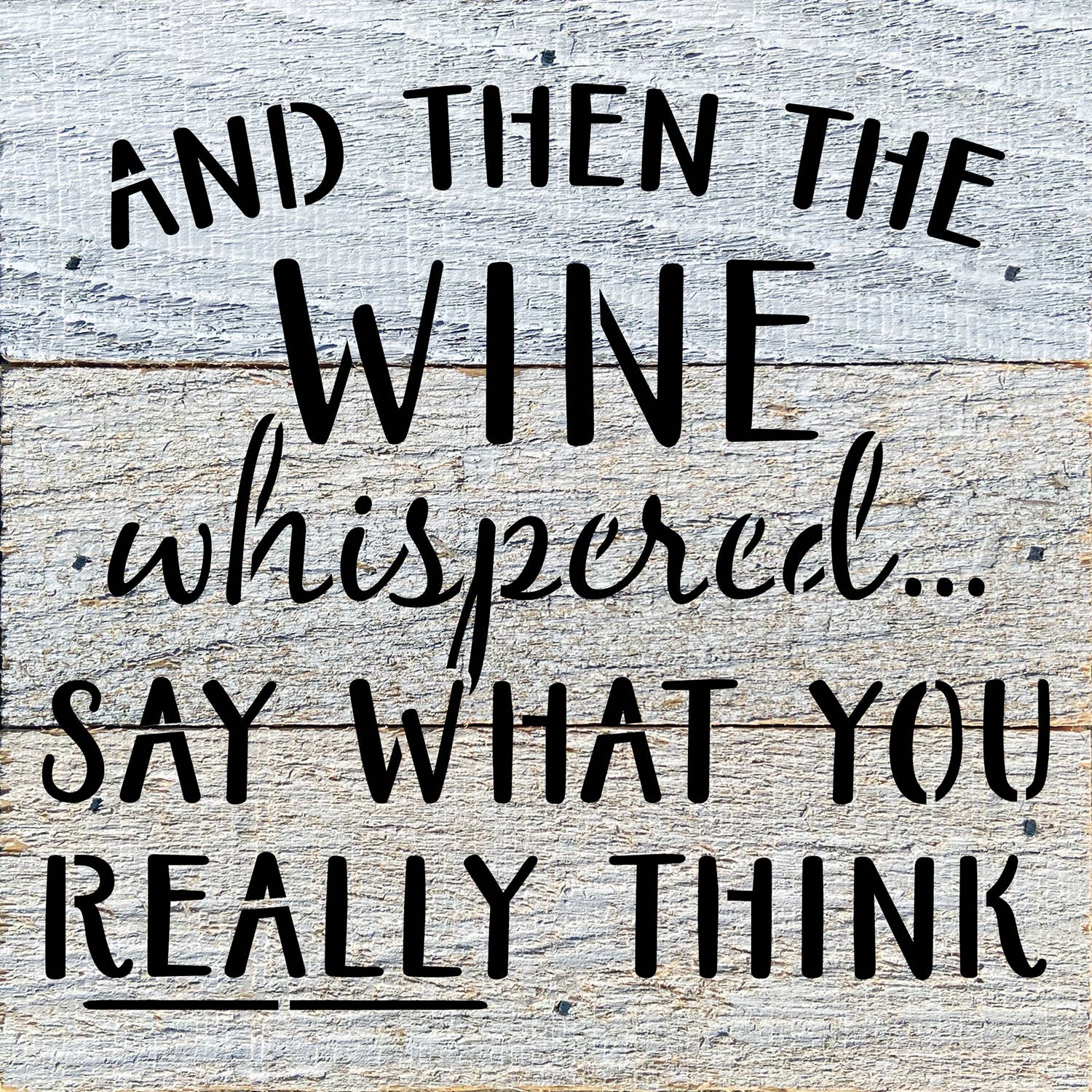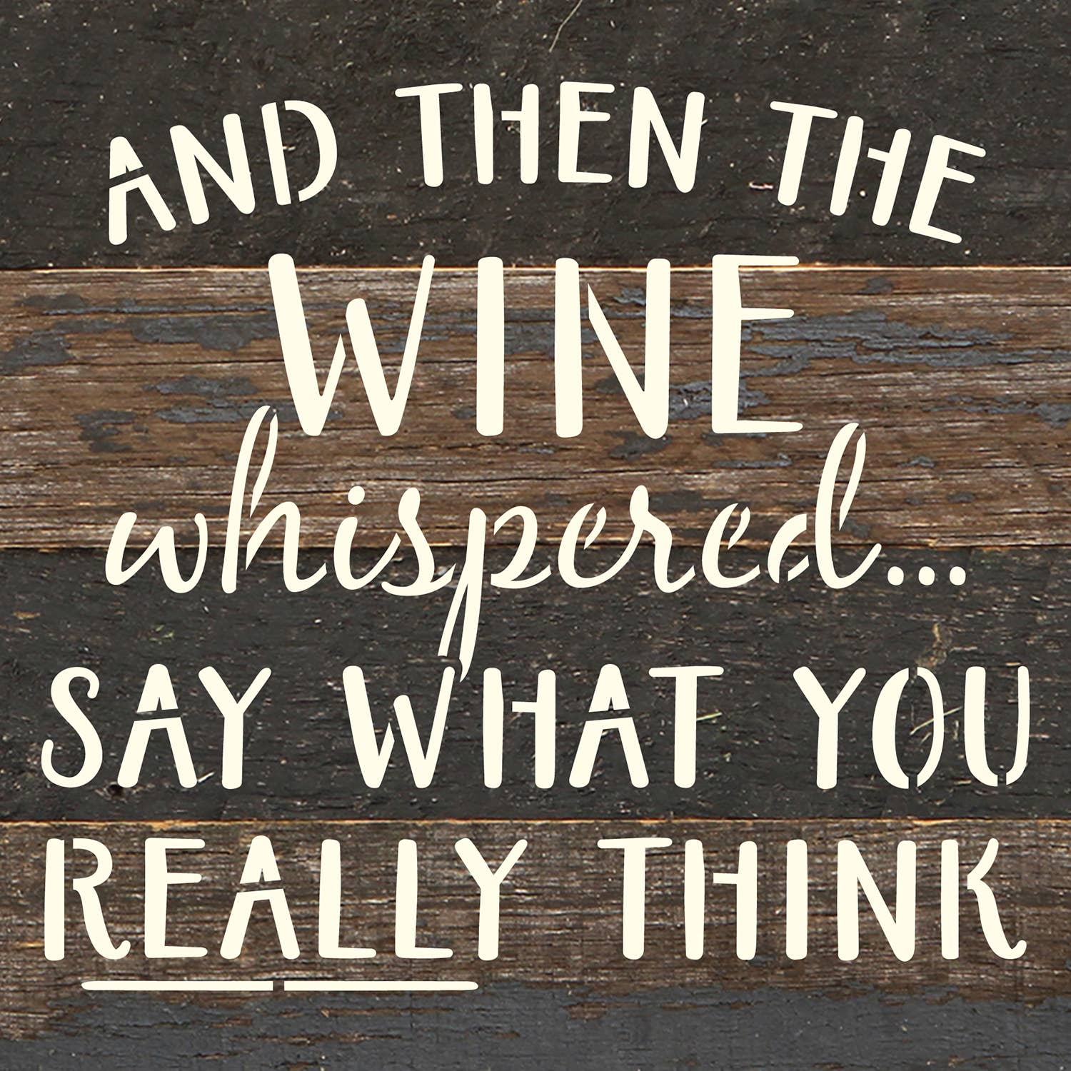 And then the wine whispered…say what you really think 6x6 Reclaimed Wood Wall DécorSecond Nature by Hand product are Made in the USA by skilled craftsmen in WI. We source distressed reclaimed materials throughout North America that ensures no two Second Nature by Hand signs in the world are the same. The wood for this sign may have come from a ship yard, old factory or a huge variety of other sources. Buying reclaimed wood products is good for the environment. Due to the reclaimed nature of this product, colors and wood tones/features may vary slightly.