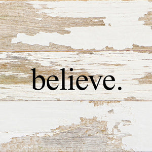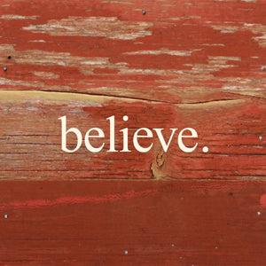 Believe. / 6"x6" Reclaimed Wood Sign // Second Nature by Hand product is Made in the USA by skilled craftsmen in IA and WI. We source distressed natural reclaimed materials throughout North America that ensures no two Second Nature by Hand signs in the world are the same. The wood for this sign may have come from a ship yard, old factory or a huge variety of other sources. Buying reclaimed wood products is good for the environment. Due to the reclaimed nature of this product, colors and wood tones/features may vary slightly.