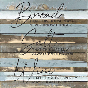 Bread that this house may never know hunger Salt that this life may always have flavor. Wine that joy & prosperity may reign forever 28x28 Reclaimed Wood Sign Second Nature by Hand product are Made in the USA by skilled craftsmen in WI. We source distressed reclaimed materials throughout North America that ensures no two Second Nature by Hand signs in the world are the same. The wood for this sign may have come from a ship yard, old factory or a huge variety of other sources. Buying reclaimed wood products is good for the environment. Due to the reclaimed nature of this product, colors and wood tones/features may vary slightly.