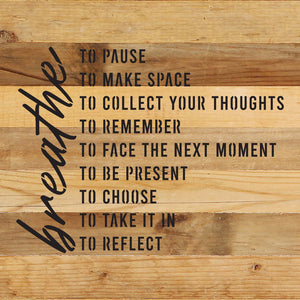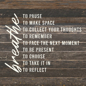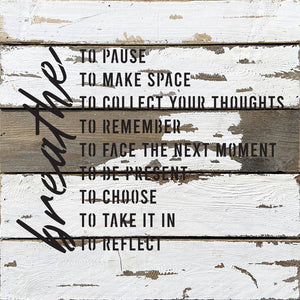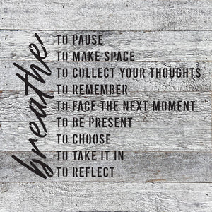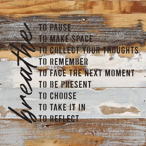 Breathe to pause. To make space. To collect your thoughts … 14x14 Reclaimed Wood Wall Décor//14"x14" Reclaimed Wood Sign //Second Nature by Hand product is Made in the USA by skilled craftsmen in WI. We source distressed reclaimed materials throughout North America that ensures no two Second Nature by Hand signs in the world are the same. The wood for this sign may have come from a ship yard, old factory or a huge variety of other sources. Buying reclaimed wood products is good for the environment. Due to the reclaimed nature of this product, colors and wood tones/features may vary slightly.