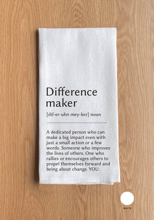 Introducing the Difference Maker White Kitchen Towel from Second Nature by Hand. This tea towel is more than just a kitchen accessory; it's a testament to our commitment to quality and craftsmanship. Each piece we create tells a story, carries a soul, and represents a moment of history. Our products are made with care, reflecting the strength and uniqueness of our one-of-a-kind products. Remember, they don't make things like they used to, but we do.