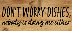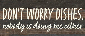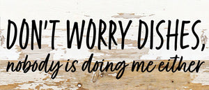 Don't worry dishes, nobody is doing me either / 14x6 Reclaimed Wood Wall Decor // Our products are Made in the USA by skilled craftsmen in IA and WI. We source distressed natural reclaimed materials throughout North America that ensures no two Second Nature by Hand signs in the world are the same. The wood for this sign may have come from a ship yard, old factory or a huge variety of other sources. Buying reclaimed wood products is good for the environment. Due to the reclaimed nature of this product, colors and wood tones/features may vary slightly.