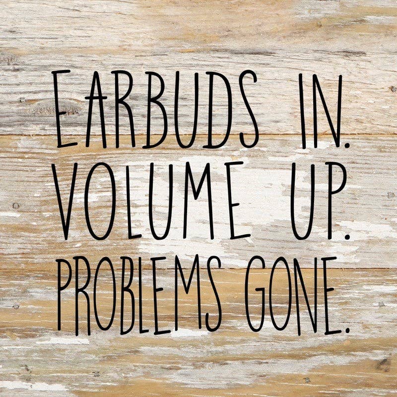 Earbuds in. Volume Up. Problems Gone. / 6"x6" Reclaimed Wood Sign // Second Nature by Hand product is Made in the USA by skilled craftsmen in IA and WI. We source distressed natural reclaimed materials throughout North America that ensures no two Second Nature by Hand signs in the world are the same. The wood for this sign may have come from a ship yard, old factory or a huge variety of other sources. Buying reclaimed wood products is good for the environment. Due to the reclaimed nature of this product, colors and wood tones/features may vary slightly.