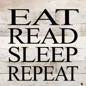 Eat, read, sleep, repeat. / 10"x10" Reclaimed Wood Sign // Second Nature by Hand product is Made in the USA by skilled craftsmen in IA and WI. We source distressed natural reclaimed materials throughout North America that ensures no two Second Nature by Hand signs in the world are the same. The wood for this sign may have come from a ship yard, old factory or a huge variety of other sources. Buying reclaimed wood products is good for the environment. Due to the reclaimed nature of this product, colors and wood tones/features may vary slightly.