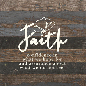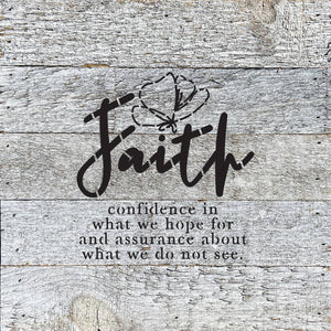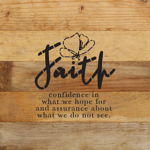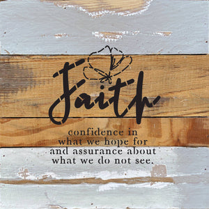 Faith confidence in what we hope for and assurance about what we do not see 10x10 Reclaimed Wood Wall Décor. Second Nature by Hand product are Made in the USA by skilled craftsmen in WI. We source distressed reclaimed materials throughout North America that ensures no two Second Nature by Hand signs in the world are the same. The wood for this sign may have come from a ship yard, old factory or a huge variety of other sources. Buying reclaimed wood products is good for the environment. Due to the reclaimed nature of this product, colors and wood tones/features may vary slightly