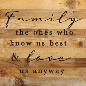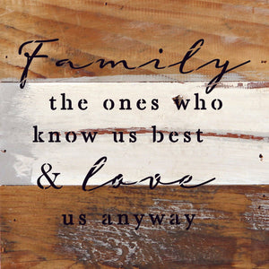 Family, the ones who know us best and love us anyways / 10"X10" Reclaimed Wood Sign // Second Nature by Hand product is Made in the USA by skilled craftsmen in IA and WI. We source distressed natural reclaimed materials throughout North America that ensures no two Second Nature by Hand signs in the world are the same. The wood for this sign may have come from a ship yard, old factory or a huge variety of other sources. Buying reclaimed wood products is good for the environment. Due to the reclaimed nature of this product, colors and wood tones/features may vary slightly.