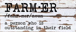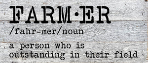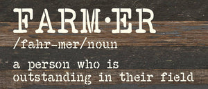 Farmer Definition 14x6 Reclaimed Wood Wall DécorSecond Nature by Hand product are Made in the USA by skilled craftsmen in WI. We source distressed reclaimed materials throughout North America that ensures no two Second Nature by Hand signs in the world are the same. The wood for this sign may have come from a ship yard, old factory or a huge variety of other sources. Buying reclaimed wood products is good for the environment. Due to the reclaimed nature of this product, colors and wood tones/features may vary slightly.