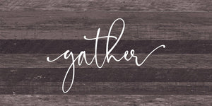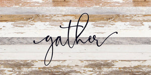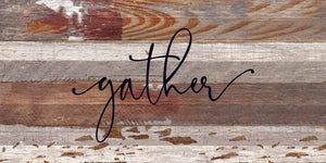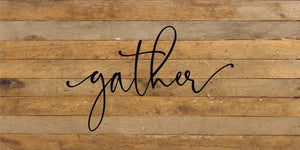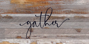 Gather / 24"x12" Reclaimed Wood Sign // Second Nature by Hand product is Made in the USA by skilled craftsmen in IA and WI. We source distressed natural reclaimed materials throughout North America that ensures no two Second Nature by Hand signs in the world are the same. The wood for this sign may have come from a ship yard, old factory or a huge variety of other sources. Buying reclaimed wood products is good for the environment. Due to the reclaimed nature of this product, colors and wood tones/features may vary slightly.