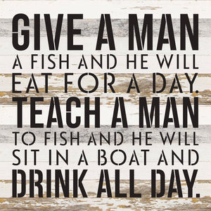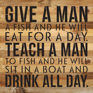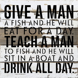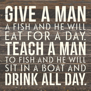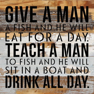 Give a man a fish and he will eat for a day. Teach a man to fish and he will sit on a boat and drink all day / 14x14 Reclaimed Wood Wall Decor