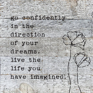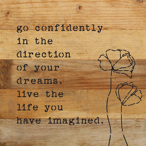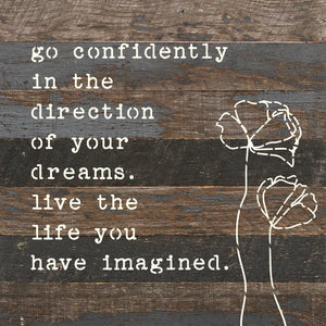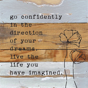 Go confidently in the direction of you dreams. Live the life you have imagined 10x10 Reclaimed Wood Wall Décor. Second Nature by Hand product are Made in the USA by skilled craftsmen in WI. We source distressed reclaimed materials throughout North America that ensures no two Second Nature by Hand signs in the world are the same. The wood for this sign may have come from a ship yard, old factory or a huge variety of other sources. Buying reclaimed wood products is good for the environment. Due to the reclaimed nature of this product, colors and wood tones/features may vary slightly