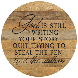 God is still writing your story. Quit trying to steal the pen. Trust the author 16in Round Reclaimed Wood Wall Décor//16" Reclaimed Wood Sign //Second Nature by Hand product is Made in the USA by skilled craftsmen in WI. We source distressed reclaimed materials throughout North America that ensures no two Second Nature by Hand signs in the world are the same. The wood for this sign may have come from a ship yard, old factory or a huge variety of other sources. Buying reclaimed wood products is good for the environment. Due to the reclaimed nature of this product, colors and wood tones/features may vary slightly.