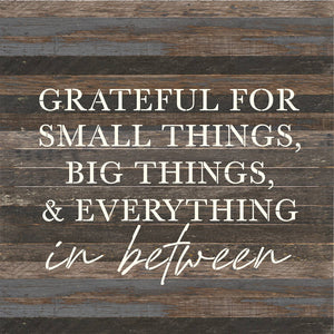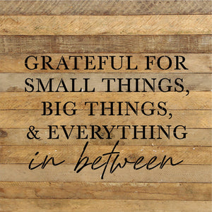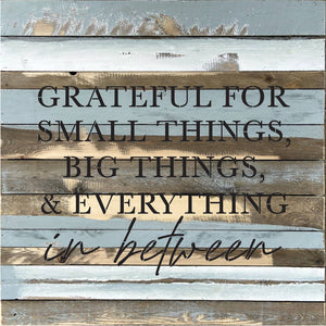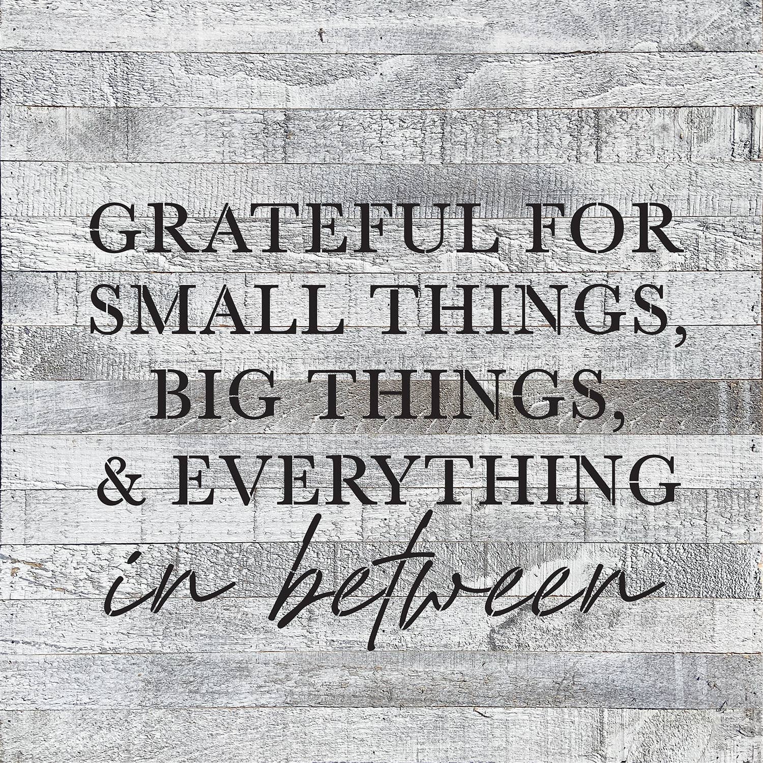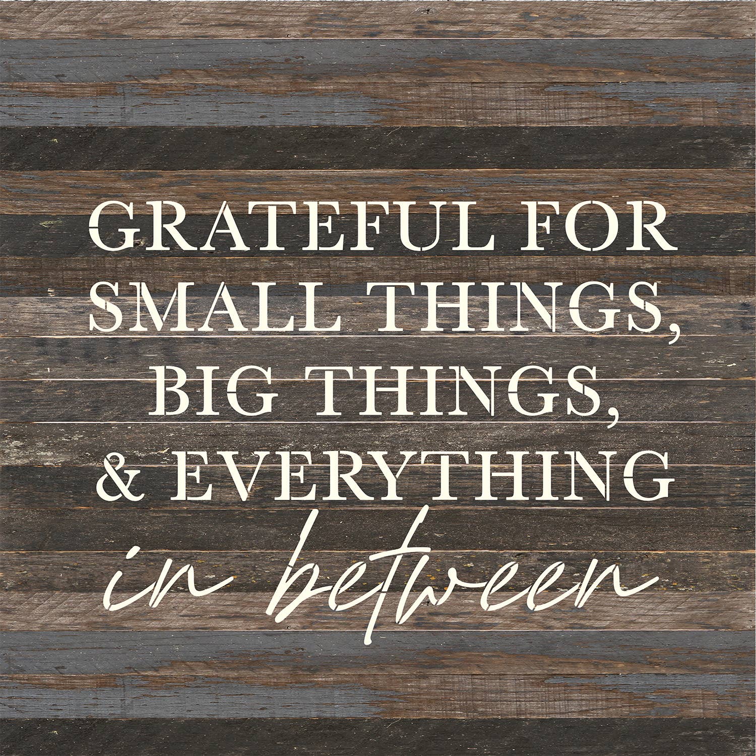 Grateful for small things, big things, and everything in between 28x28 Reclaimed Wood Sign Second Nature by Hand product are Made in the USA by skilled craftsmen in WI. We source distressed reclaimed materials throughout North America that ensures no two Second Nature by Hand signs in the world are the same. The wood for this sign may have come from a ship yard, old factory or a huge variety of other sources. Buying reclaimed wood products is good for the environment. Due to the reclaimed nature of this product, colors and wood tones/features may vary slightly.