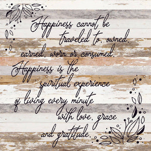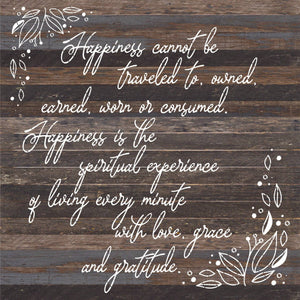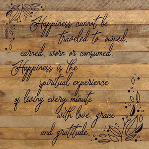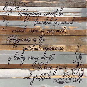Happiness cannot be traveled to owned earned worn or consumed. Happiness is the spiritual experience of living every minute with love, grace and gratitude. / 28"X28" Reclaimed Wood Sign
