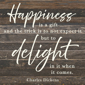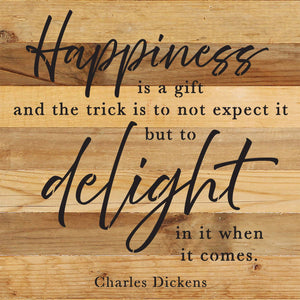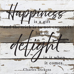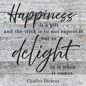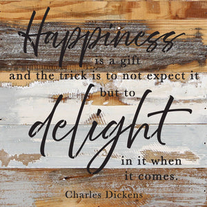 Happiness is a gift and the trick is not to expect it but to delight in it when it comes- Charles Dickens 14x14 Reclaimed Wood Wall Décor. Second Nature by Hand product are Made in the USA by skilled craftsmen in WI. We source distressed reclaimed materials throughout North America that ensures no two Second Nature by Hand signs in the world are the same. The wood for this sign may have come from a ship yard, old factory or a huge variety of other sources. Buying reclaimed wood products is good for the environment. Due to the reclaimed nature of this product, colors and wood tones/features may vary slightly.