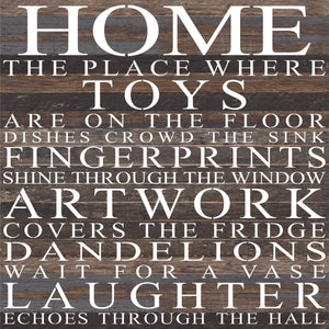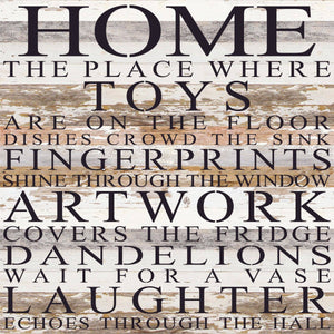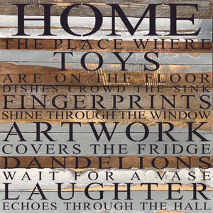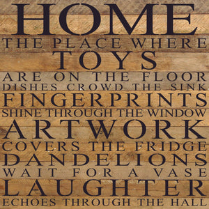Home. The place where toys are on the floor dishes crowd the sink fingerprints shine through the window art work cover the fridge dandelions wait for a vase laughter echoes through the hall / 28"x28" Reclaimed Wood Sign