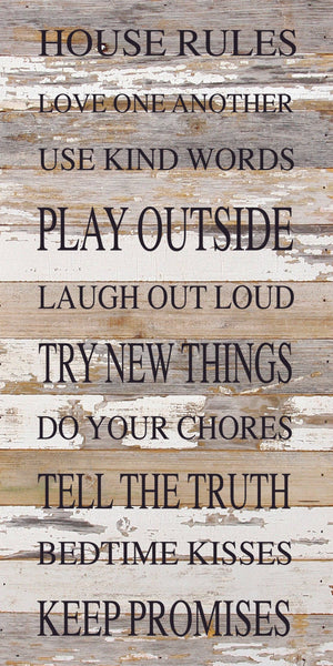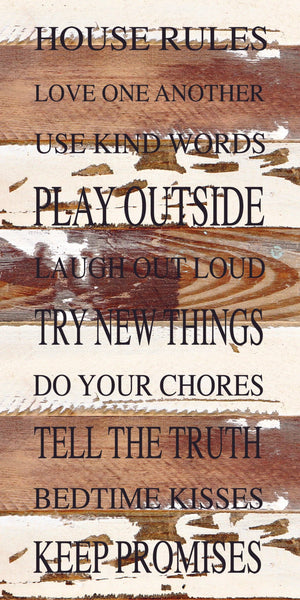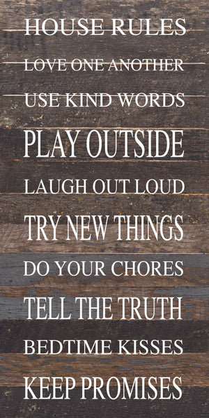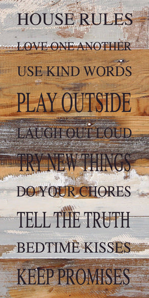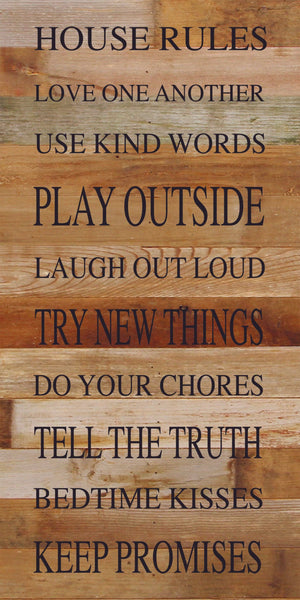 HOUSE RULES Love on another Use kind words Play outside Laugh out loud Try new things Do your chores Tell the truth Bedtime kisses Keep Promises / 12"x24" Reclaimed Wood Sign