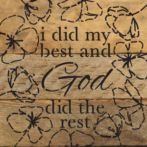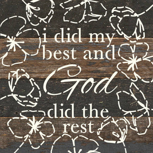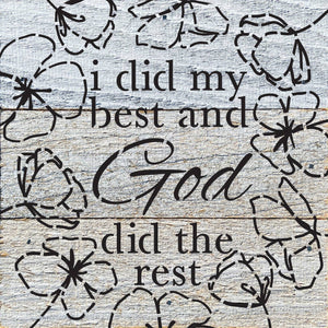 I did my best and God did the rest 6x6 Reclaimed Wood Wall Décor. Second Nature by Hand product are Made in the USA by skilled craftsmen in WI. We source distressed reclaimed materials throughout North America that ensures no two Second Nature by Hand signs in the world are the same. The wood for this sign may have come from a ship yard, old factory or a huge variety of other sources. Buying reclaimed wood products is good for the environment. Due to the reclaimed nature of this product, colors and wood tones/features may vary slightly