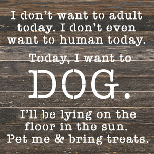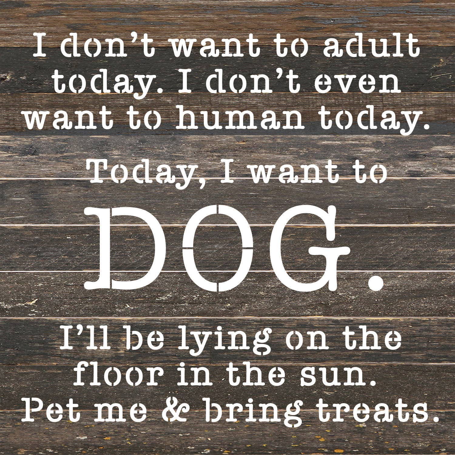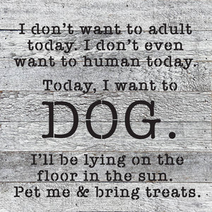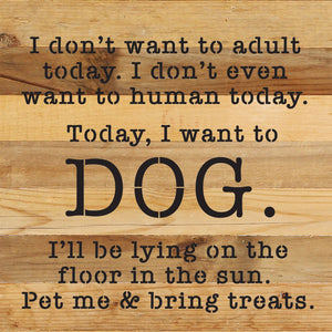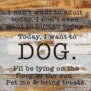 I don't want to adult today. I don't even want to human today. Today, I want to DOG. I'll be lying on the floor in the sun. Pet me & bring treats 14x14 Reclaimed Wood Wall Décor Second Nature by Hand product are Made in the USA by skilled craftsmen in WI. We source distressed reclaimed materials throughout North America that ensures no two Second Nature by Hand signs in the world are the same. The wood for this sign may have come from a ship yard, old factory or a huge variety of other sources. Buying reclaimed wood products is good for the environment. Due to the reclaimed nature of this product, colors and wood tones/features may vary slightly.