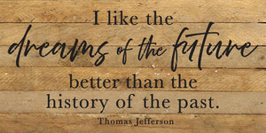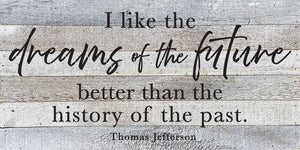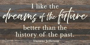 I like the dreams of the future better than the history of the past - Thomas Jefferson 24x12 Reclaimed Wood Wall Décor. Second Nature by Hand product are Made in the USA by skilled craftsmen in WI. We source distressed reclaimed materials throughout North America that ensures no two Second Nature by Hand signs in the world are the same. The wood for this sign may have come from a ship yard, old factory or a huge variety of other sources. Buying reclaimed wood products is good for the environment. Due to the reclaimed nature of this product, colors and wood tones/features may vary slightly