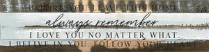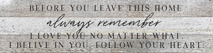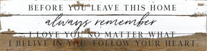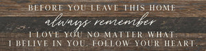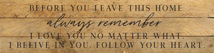 Before you leave this home always remember I love you no matter what. I believe in you. Follow your heart 24x6 Reclaimed Wood Wall Decor Sign//24"x6" Reclaimed Wood Sign //Second Nature by Hand product is Made in the USA by skilled craftsmen in WI. We source distressed reclaimed materials throughout North America that ensures no two Second Nature by Hand signs in the world are the same. The wood for this sign may have come from a ship yard, old factory or a huge variety of other sources. Buying reclaimed wood products is good for the environment. Due to the reclaimed nature of this product, colors and wood tones/features may vary slightly.