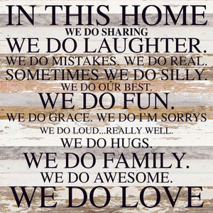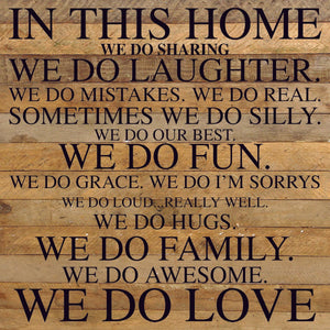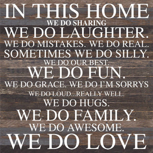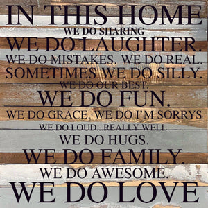 In this home we do sharing. We do laughter. We do mistakes. We do real. Sometimes we do silly. We do our best. We do fun. We do grace. We do I'm sorrys. We do loud... really well. / 28"x28" Reclaimed Wood Sign