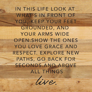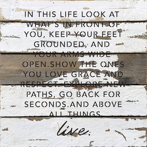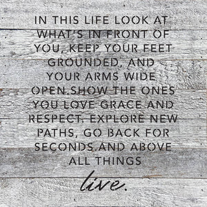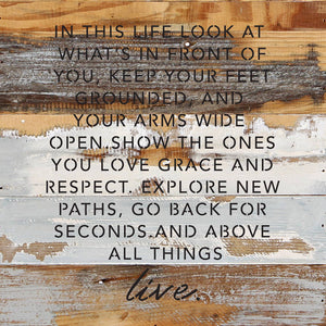 In this life look at what's in front of you, keep your feet grounded, and your arms wide open... 14x14 Reclaimed Wood Wall Décor//14"x14" Reclaimed Wood Sign //Second Nature by Hand product is Made in the USA by skilled craftsmen in WI. We source distressed reclaimed materials throughout North America that ensures no two Second Nature by Hand signs in the world are the same. The wood for this sign may have come from a ship yard, old factory or a huge variety of other sources. Buying reclaimed wood products is good for the environment. Due to the reclaimed nature of this product, colors and wood tones/features may vary slightly.