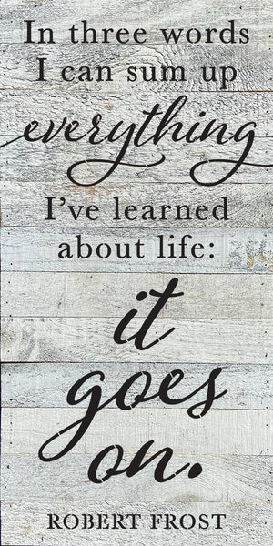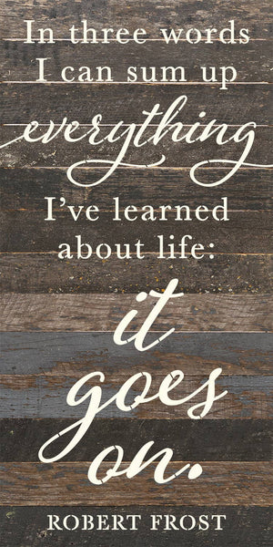In three words, I can sum up everything I've learned about life: It goes on - Robert Frost 24x12 Reclaimed Wood Wall Décor. Second Nature by Hand product are Made in the USA by skilled craftsmen in WI. We source distressed reclaimed materials throughout North America that ensures no two Second Nature by Hand signs in the world are the same. The wood for this sign may have come from a ship yard, old factory or a huge variety of other sources. Buying reclaimed wood products is good for the environment. Due to the reclaimed nature of this product, colors and wood tones/features may vary slightly