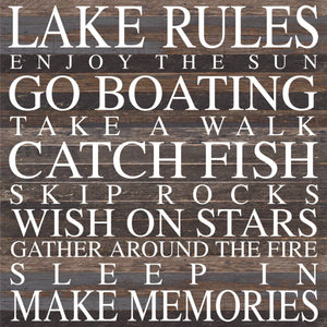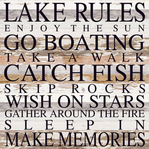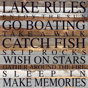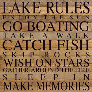 Lake Rules Enjoy the sun Go boating Take a walk Catch fish Skip rocks Wish on stars Gather around the fire Sleep in Make memories / 28"x28" Reclaimed Wood Sign