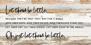 The "Let them be little because they're only that way for awhile..." 24x12 Reclaimed Wood Sign is a unique piece from Second Nature by Hand. We create one-of-a-kind wall signs that carry a story, a soul, and a moment of history. Made from reclaimed materials, our products are fleeting treasures, offering a piece of the past to enrich your home. This sign, like all our pieces, is handcrafted with care, reflecting our commitment to quality and authenticity. Order now and add a touch of history to your home decor. Please note, our shipping window is about two weeks.