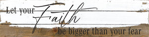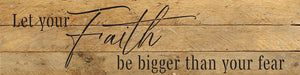 Let your faith be bigger than your fear 24x6 Reclaimed Wood Wall Decor Sign//24"x6" Reclaimed Wood Sign //Second Nature by Hand product is Made in the USA by skilled craftsmen in WI. We source distressed reclaimed materials throughout North America that ensures no two Second Nature by Hand signs in the world are the same. The wood for this sign may have come from a ship yard, old factory or a huge variety of other sources. Buying reclaimed wood products is good for the environment. Due to the reclaimed nature of this product, colors and wood tones/features may vary slightly.
