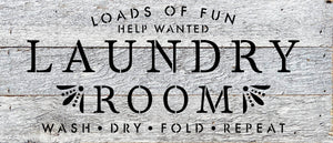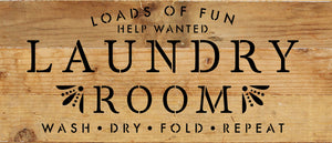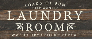Loads of fun. Help wanted. Laundry Room. Wash. Dry. Fold. Repeat 14x6 Reclaimed Wood Wall Décor Second Nature by Hand product are Made in the USA by skilled craftsmen in WI. We source distressed reclaimed materials throughout North America that ensures no two Second Nature by Hand signs in the world are the same. The wood for this sign may have come from a ship yard, old factory or a huge variety of other sources. Buying reclaimed wood products is good for the environment. Due to the reclaimed nature of this product, colors and wood tones/features may vary slightly.