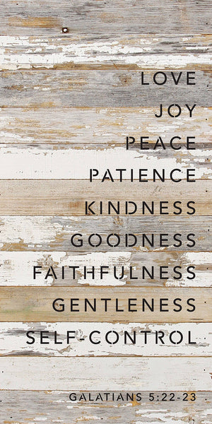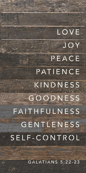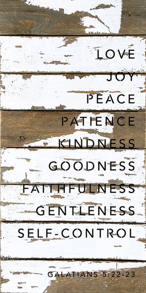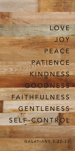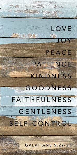 Love. Joy. Peace. Patience. Kindness. Goodness. Faithfulness. Gentleness. Self-Control Galatans 5: 22-23 / 12x24 Reclaimed Wood Wall Decor Sign