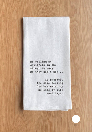 Me yelling at squirrels in the street to move they don't die… Kitchen TowelSay it with a towel! You will love this versatile kitchen towel sized just right for daily kitchen use!