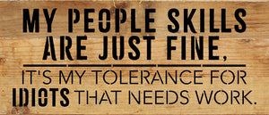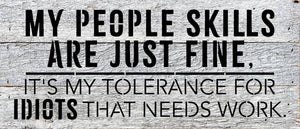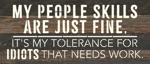 My people skills are just fine, It's my tolerance for idiots that needs work 14x6 Reclaimed Wood Wall DécorSecond Nature by Hand product are Made in the USA by skilled craftsmen in WI. We source distressed reclaimed materials throughout North America that ensures no two Second Nature by Hand signs in the world are the same. The wood for this sign may have come from a ship yard, old factory or a huge variety of other sources. Buying reclaimed wood products is good for the environment. Due to the reclaimed nature of this product, colors and wood tones/features may vary slightly.