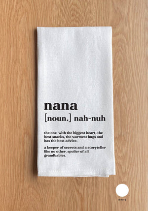 Introducing the Nana Definition White Kitchen Towel from Second Nature by Hand. This tea towel is a testament to our commitment to quality and tradition. Our products, like this one, are not just ordinary items; they are stories, souls, moments of history. Crafted in the USA, we use reclaimed materials to offer you a unique treasure, embodying our belief that people come first. Please remember, our items are handmade to order, with a shipping window of about two weeks.