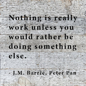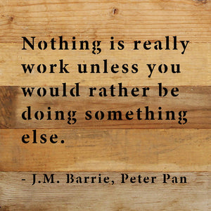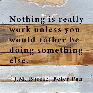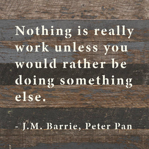 Nothing is really work unless you would rather be doing something else. - Peter Pan 10x10 Reclaimed Wood Wall Décor//10"x10" Reclaimed Wood Sign //Second Nature by Hand product is Made in the USA by skilled craftsmen in WI. We source distressed reclaimed materials throughout North America that ensures no two Second Nature by Hand signs in the world are the same. The wood for this sign may have come from a ship yard, old factory or a huge variety of other sources. Buying reclaimed wood products is good for the environment. Due to the reclaimed nature of this product, colors and wood tones/features may vary slightly.
