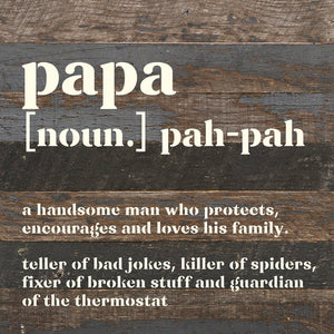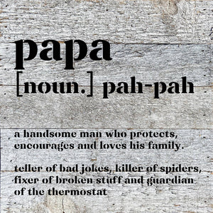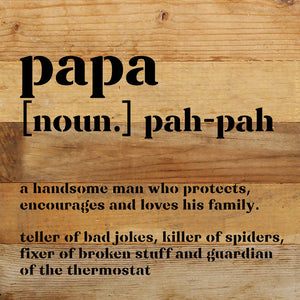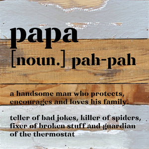 Papa definition 10x10 Reclaimed Wood Wall Décor. Second Nature by Hand product are Made in the USA by skilled craftsmen in WI. We source distressed reclaimed materials throughout North America that ensures no two Second Nature by Hand signs in the world are the same. The wood for this sign may have come from a ship yard, old factory or a huge variety of other sources. Buying reclaimed wood products is good for the environment. Due to the reclaimed nature of this product, colors and wood tones/features may vary slightly.