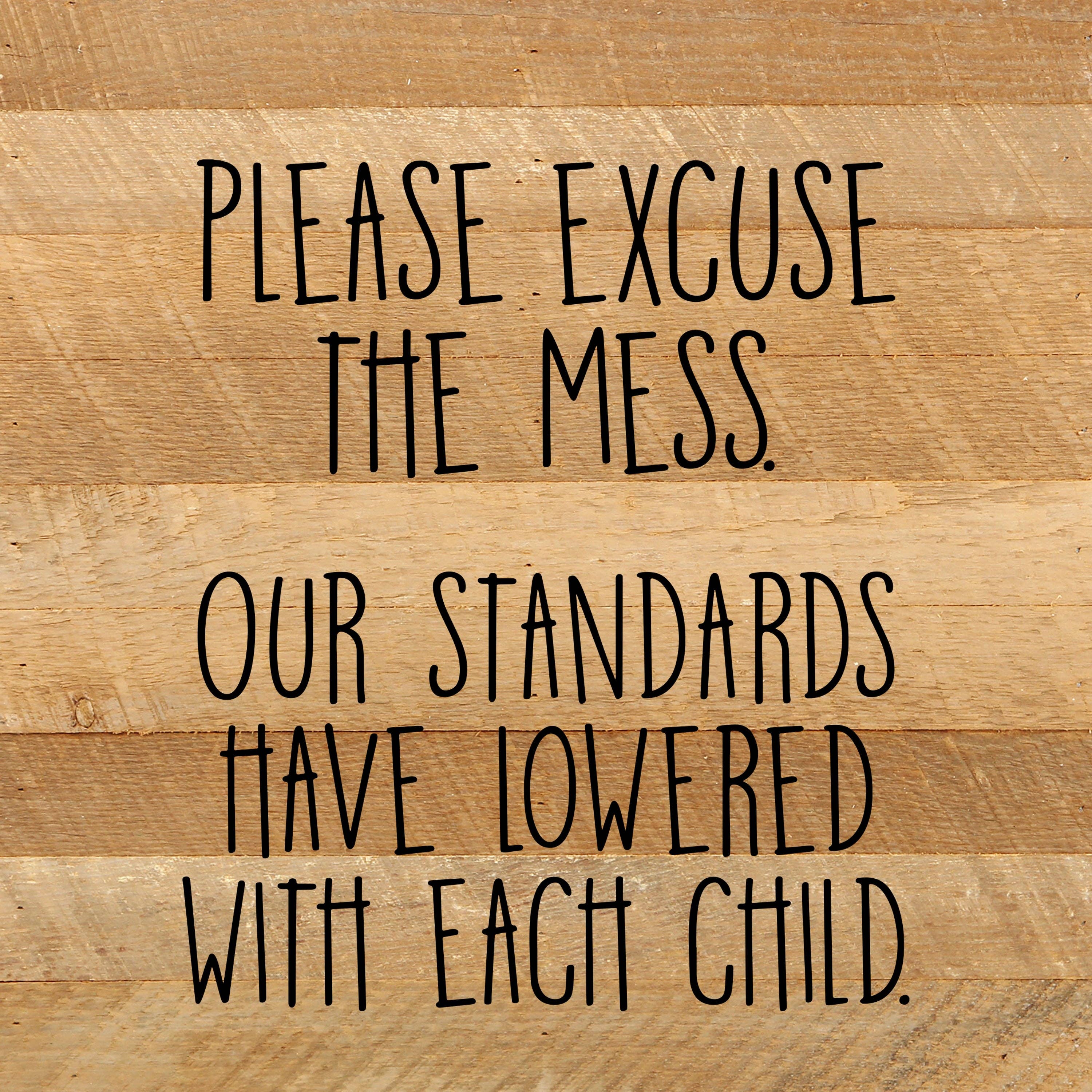 Please excuse the mess. Our standards have lowered with each child. / 10"x10" Reclaimed Wood Sign