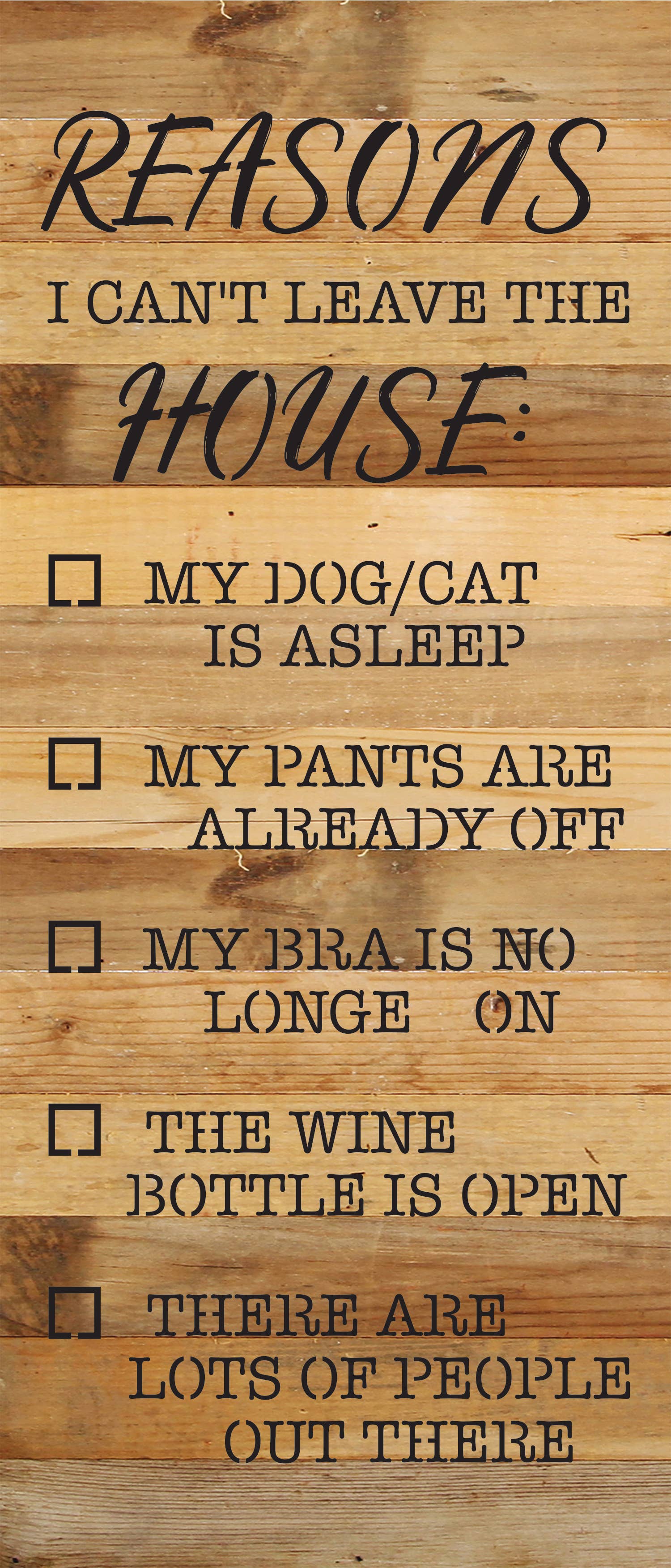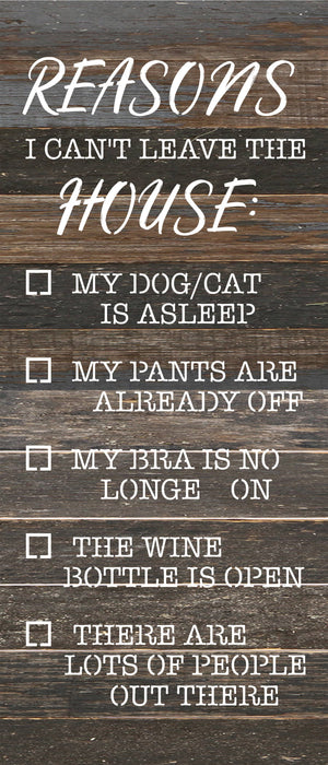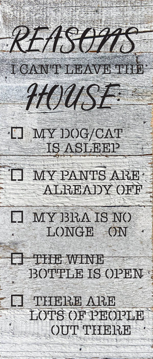 Reasons I can't leave the house: 6x14 Reclaimed Wood Wall Décor. Second Nature by Hand product are Made in the USA by skilled craftsmen in WI. We source distressed reclaimed materials throughout North America that ensures no two Second Nature by Hand signs in the world are the same. The wood for this sign may have come from a ship yard, old factory or a huge variety of other sources. Buying reclaimed wood products is good for the environment. Due to the reclaimed nature of this product, colors and wood tones/features may vary slightly.