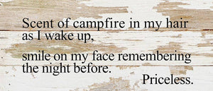 Scent of campfire in my hair as I wake up, smile on my face remembering the night before. Priceless. / 14"x6" Reclaimed Wood Sign