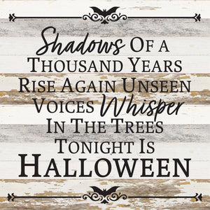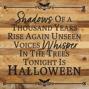 Shadows of a thousand years rise again, unseen voices whisper in the trees tonight is Halloween / 14x14 Reclaimed Wood Sign
