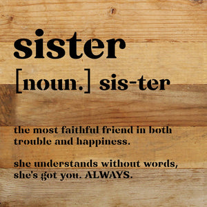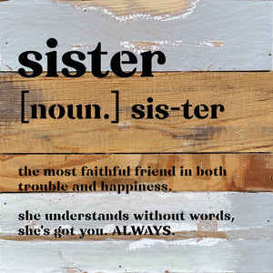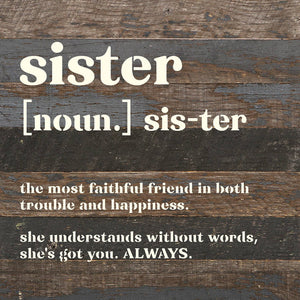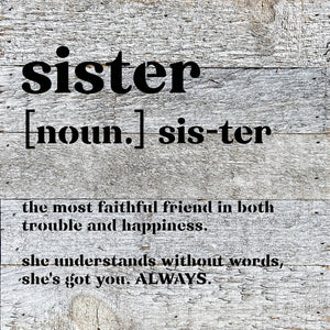 Sister definition 10x10 Reclaimed Wood Wall Décor. Second Nature by Hand product are Made in the USA by skilled craftsmen in WI. We source distressed reclaimed materials throughout North America that ensures no two Second Nature by Hand signs in the world are the same. The wood for this sign may have come from a ship yard, old factory or a huge variety of other sources. Buying reclaimed wood products is good for the environment. Due to the reclaimed nature of this product, colors and wood tones/features may vary slightly.