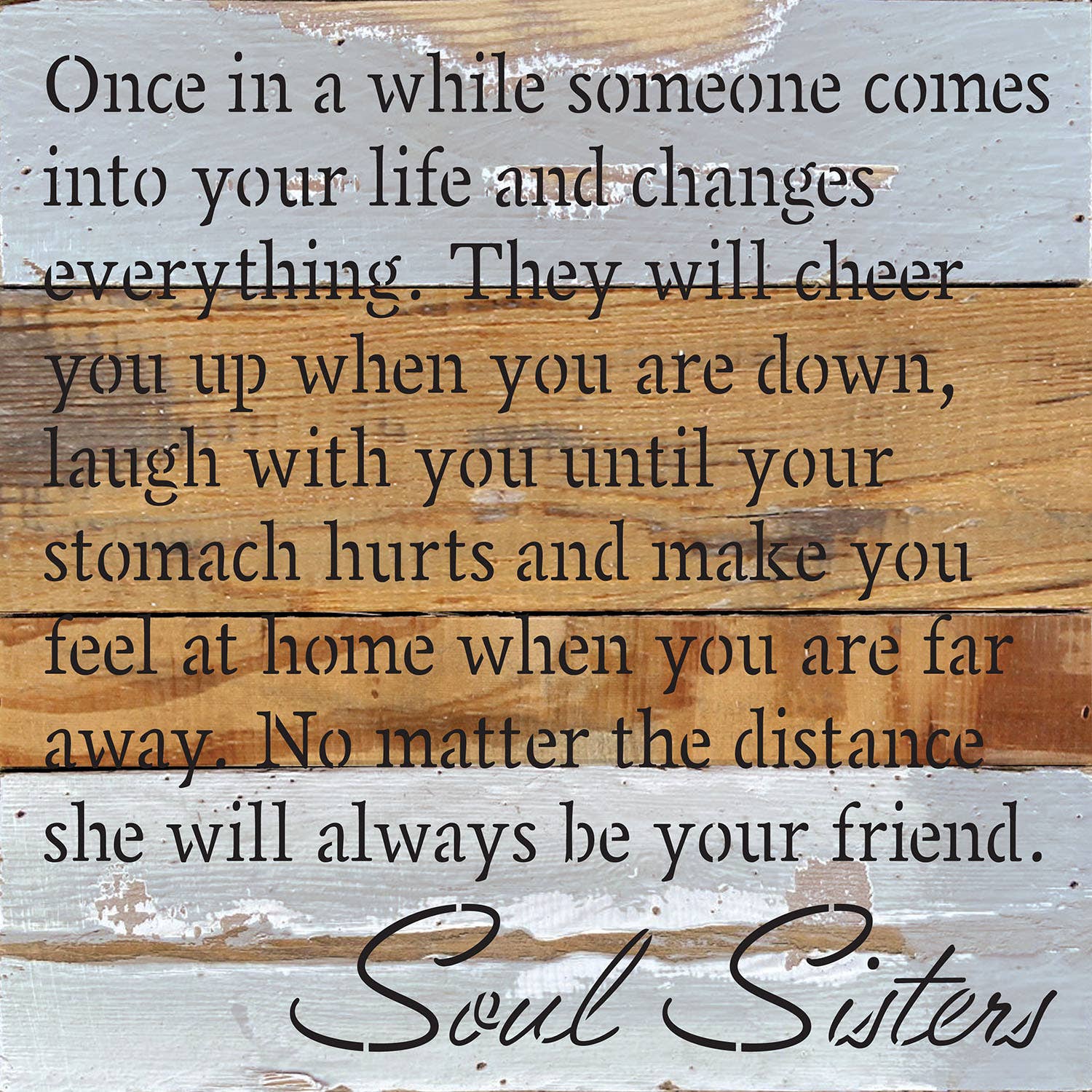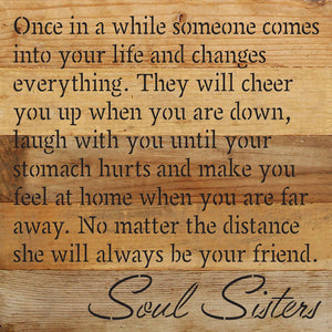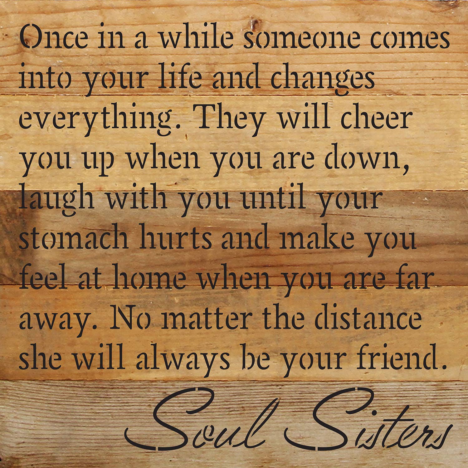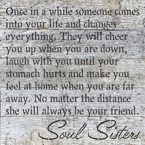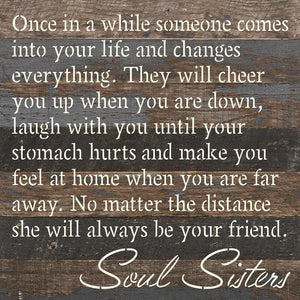 Once in a while someone comes into your life and changes everything … Soul Sisters 10x10 Reclaimed Wood Wall Décor//10"x10" Reclaimed Wood Sign //Second Nature by Hand product is Made in the USA by skilled craftsmen in WI. We source distressed reclaimed materials throughout North America that ensures no two Second Nature by Hand signs in the world are the same. The wood for this sign may have come from a ship yard, old factory or a huge variety of other sources. Buying reclaimed wood products is good for the environment. Due to the reclaimed nature of this product, colors and wood tones/features may vary slightly.
