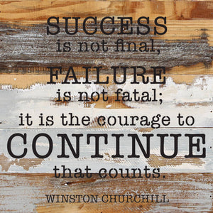 Success is not final, Failure is not fatal; it is the courage to continue that counts- Winston Churchill 14x14 Reclaimed Wood Wall Décor. Second Nature by Hand product are Made in the USA by skilled craftsmen in WI. We source distressed reclaimed materials throughout North America that ensures no two Second Nature by Hand signs in the world are the same. The wood for this sign may have come from a ship yard, old factory or a huge variety of other sources. Buying reclaimed wood products is good for the environment. Due to the reclaimed nature of this product, colors and wood tones/features may vary slightly.