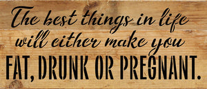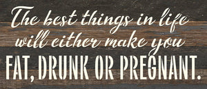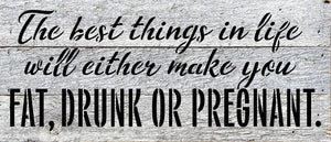 The best things in life will either make you fat, drunk, or pregnant 14x6 Reclaimed Wood Sign Reclaimed Wood Wall DécorSecond Nature by Hand product are Made in the USA by skilled craftsmen in WI. We source distressed reclaimed materials throughout North America that ensures no two Second Nature by Hand signs in the world are the same. The wood for this sign may have come from a ship yard, old factory or a huge variety of other sources. Buying reclaimed wood products is good for the environment. Due to the reclaimed nature of this product, colors and wood tones/features may vary slightly.