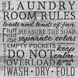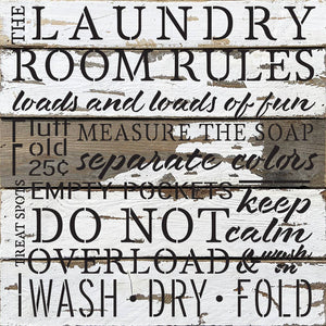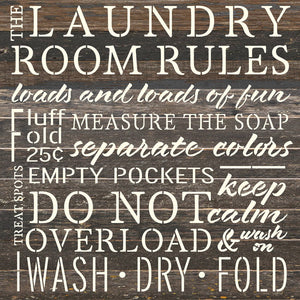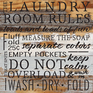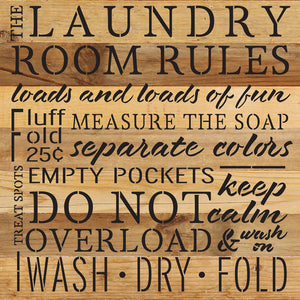 The Laundry Room Rules 14x14 Reclaimed Wood Wall Décor Second Nature by Hand product are Made in the USA by skilled craftsmen in WI. We source distressed reclaimed materials throughout North America that ensures no two Second Nature by Hand signs in the world are the same. The wood for this sign may have come from a ship yard, old factory or a huge variety of other sources. Buying reclaimed wood products is good for the environment. Due to the reclaimed nature of this product, colors and wood tones/features may vary slightly.