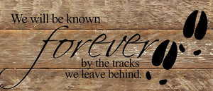 We will be know forever by the tracks we leave behind. / 14"x6" Reclaimed Wood Sign
